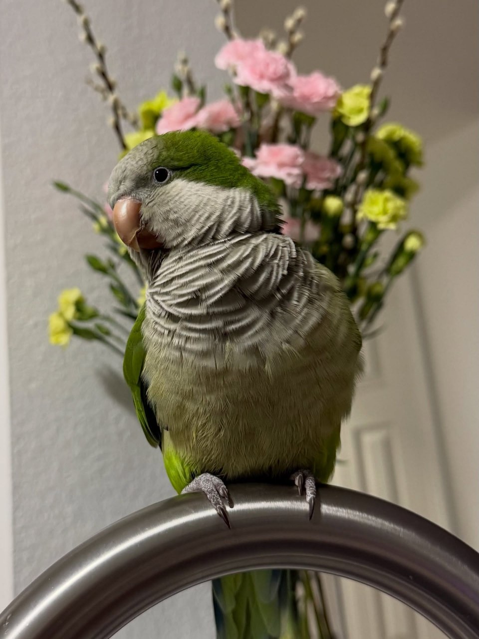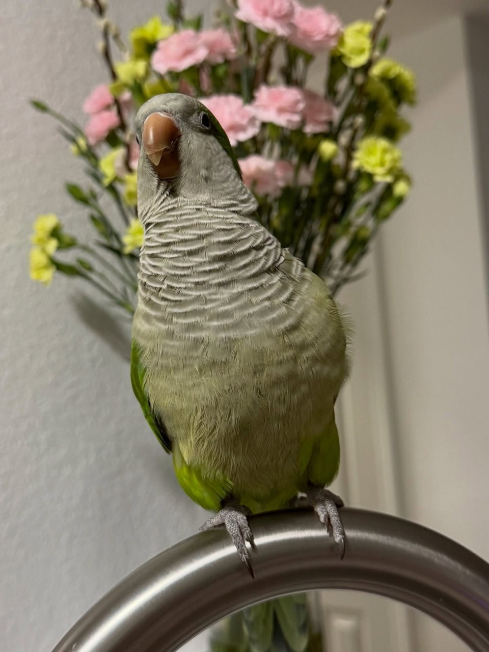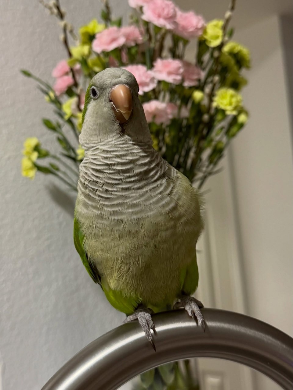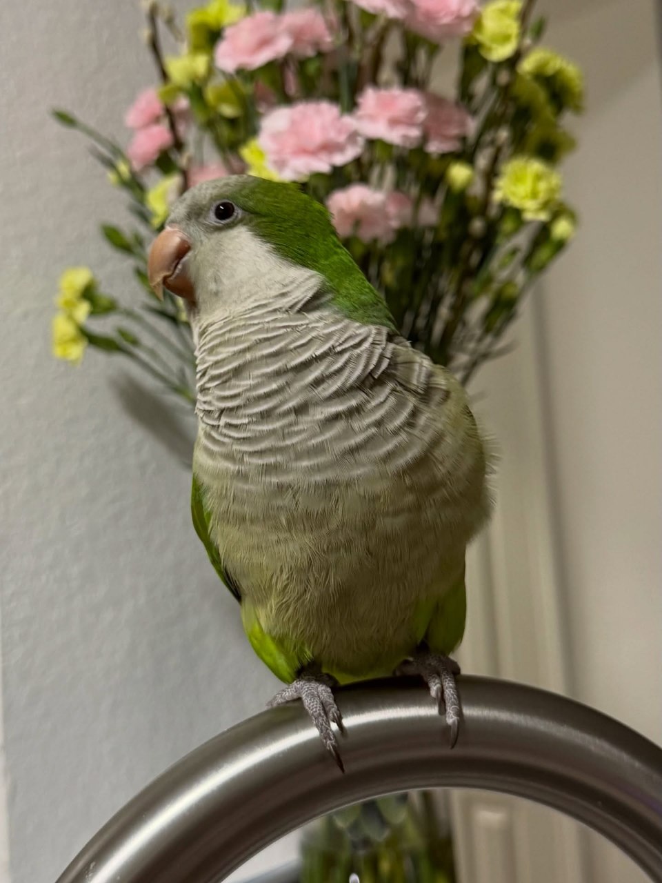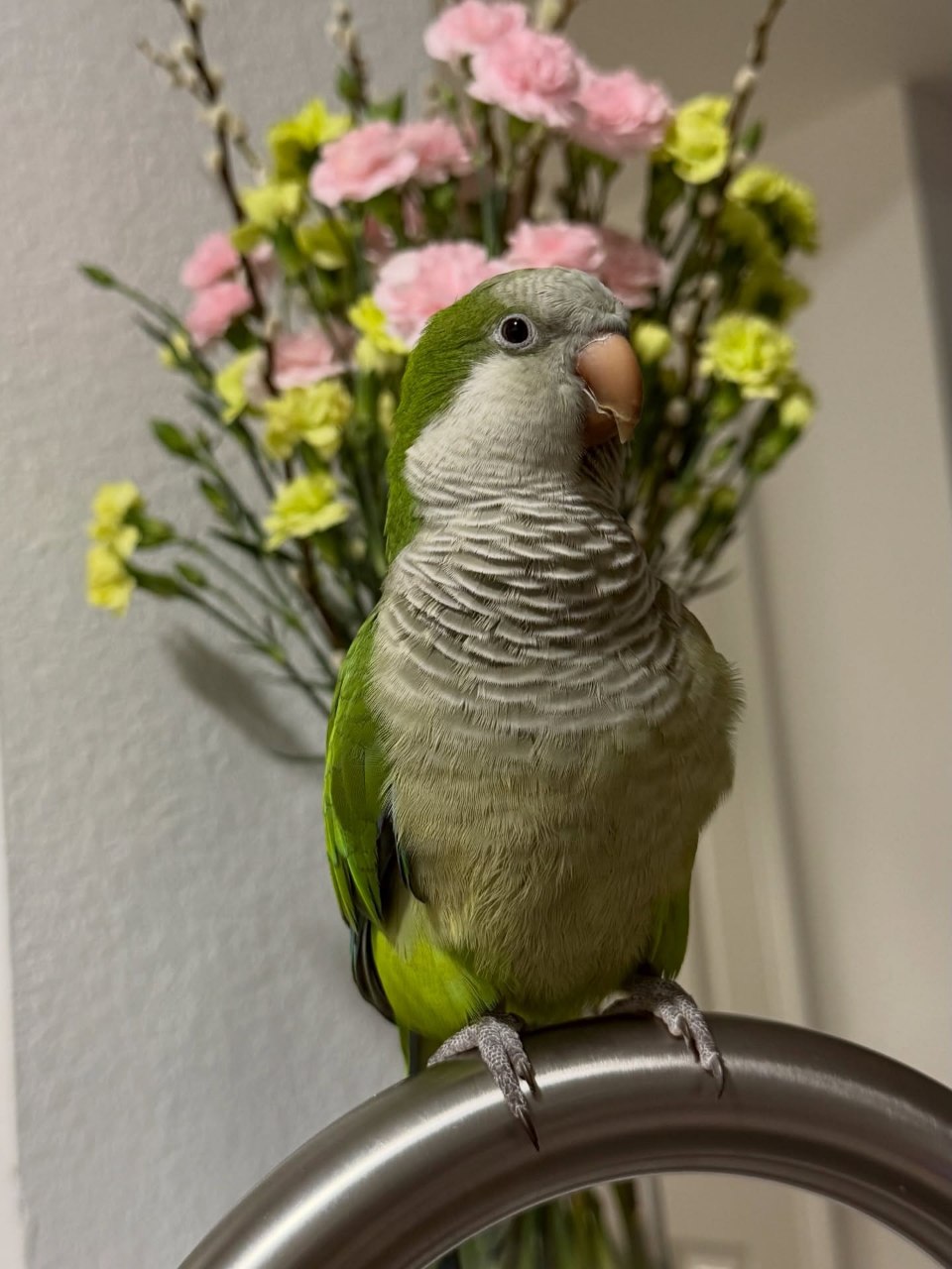 He has a dynamic personality that makes him a joy to interact with. Green Quaker parrots are naturally curious, intelligent, and social, and He exemplifies all of these traits.