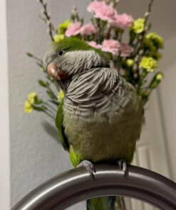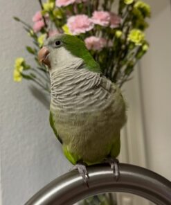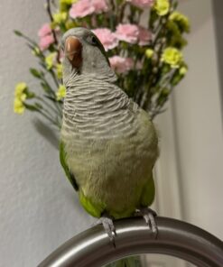 Quaker parrots (also known as Monk Parakeets) are celebrated for their intelligence, adaptability, and talking ability. He perfectly embodies these traits while adding a friendly and affectionate personality that instantly wins over bird lovers.