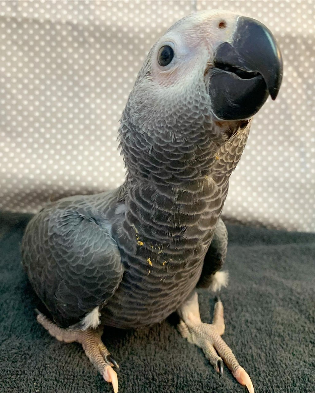 He is a hand-raised African Grey Parrot, known for being one of the most intelligent and social parrots in the world. His natural curiosity and playful demeanor make him a delight to interact with.