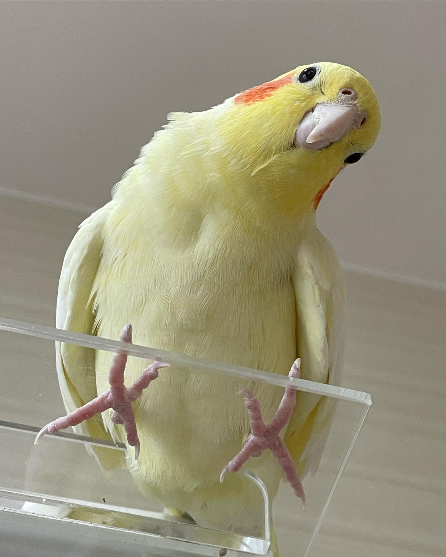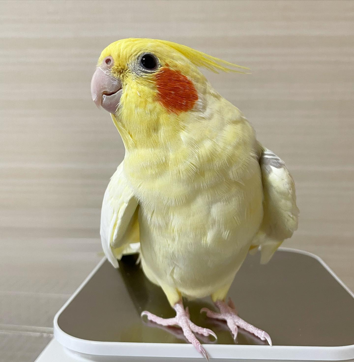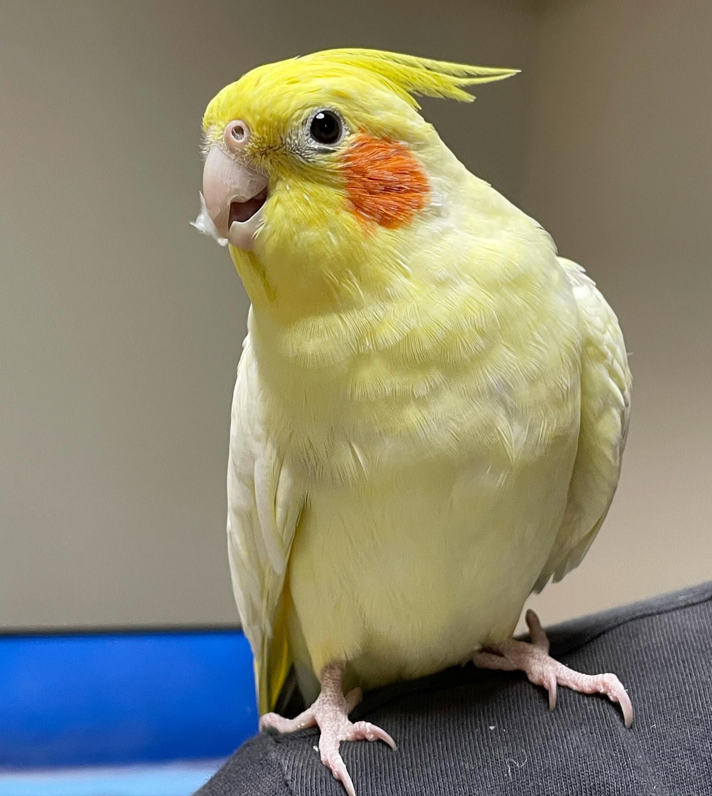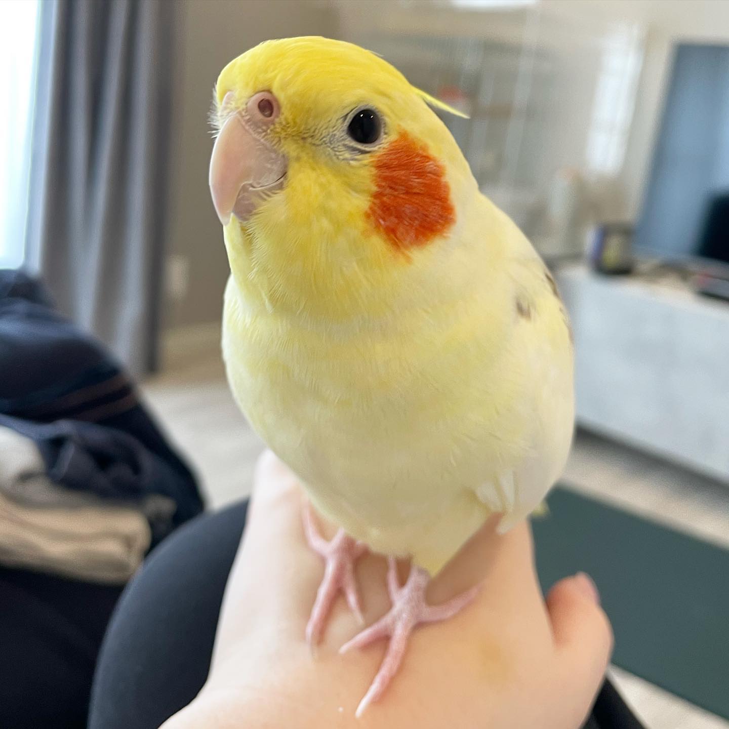 She is naturally curious and already enjoys learning whistles and simple phrases. Cockatiels are known for whistling, mimicking sounds, and playful chatter, making them entertaining companions.