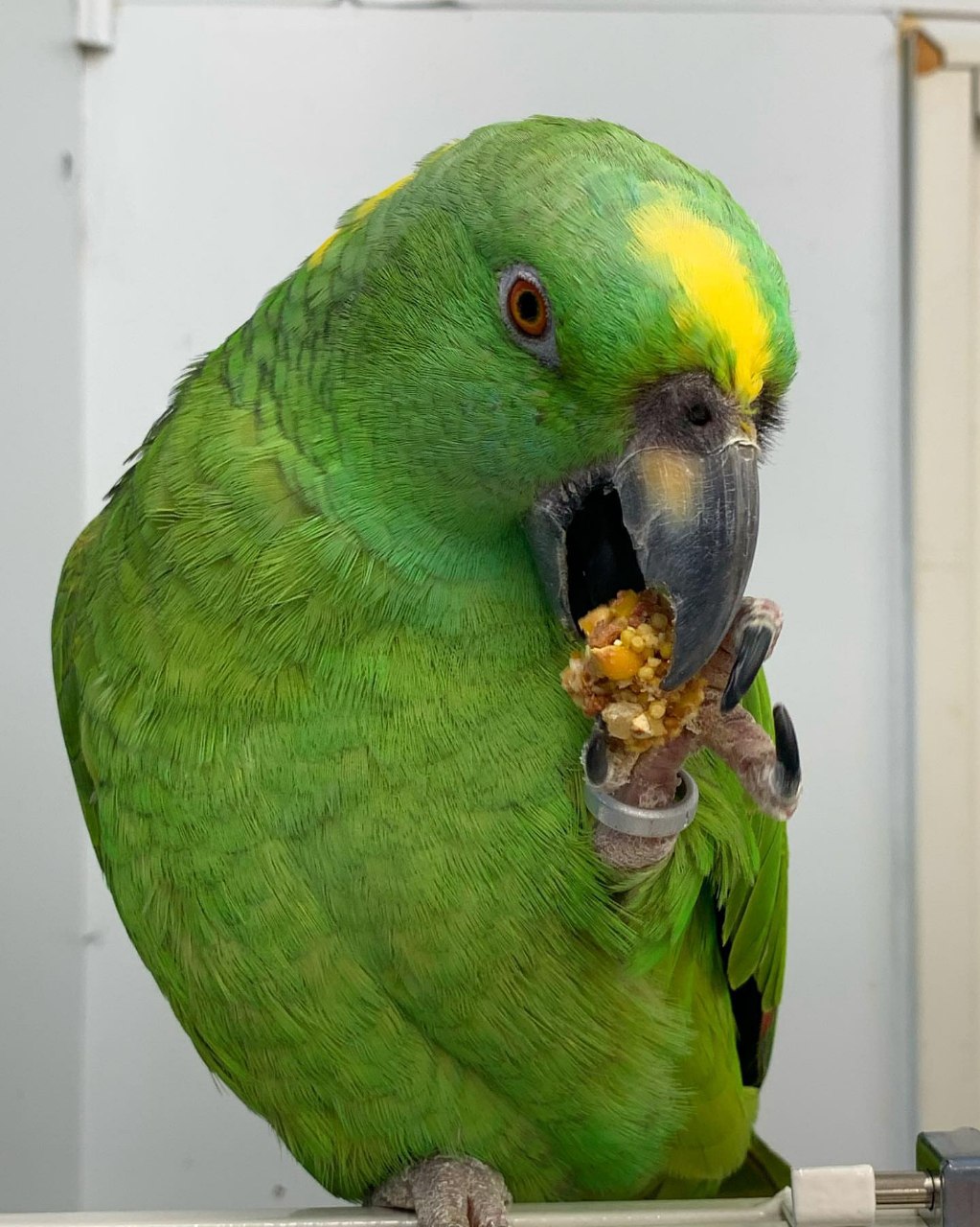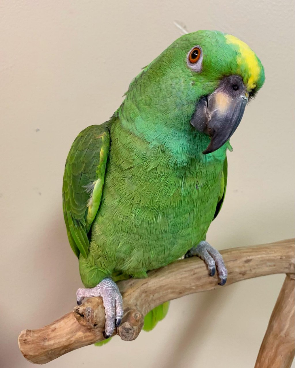 He has the classic confident personality that Amazon parrots are known for.