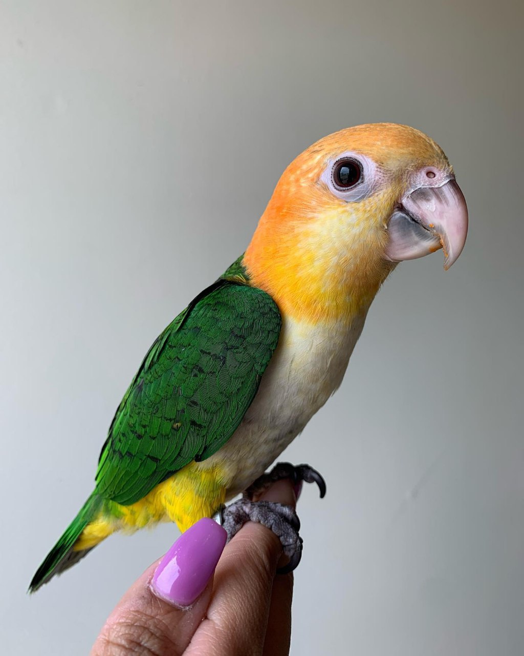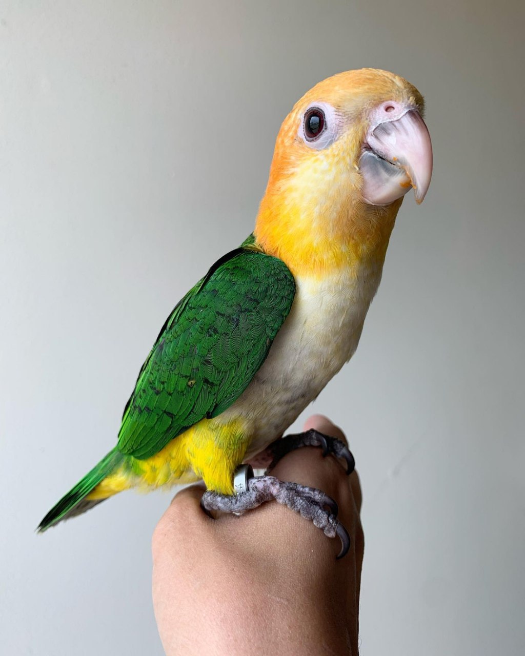 He is a beautiful example of a healthy White-Bellied Caique.