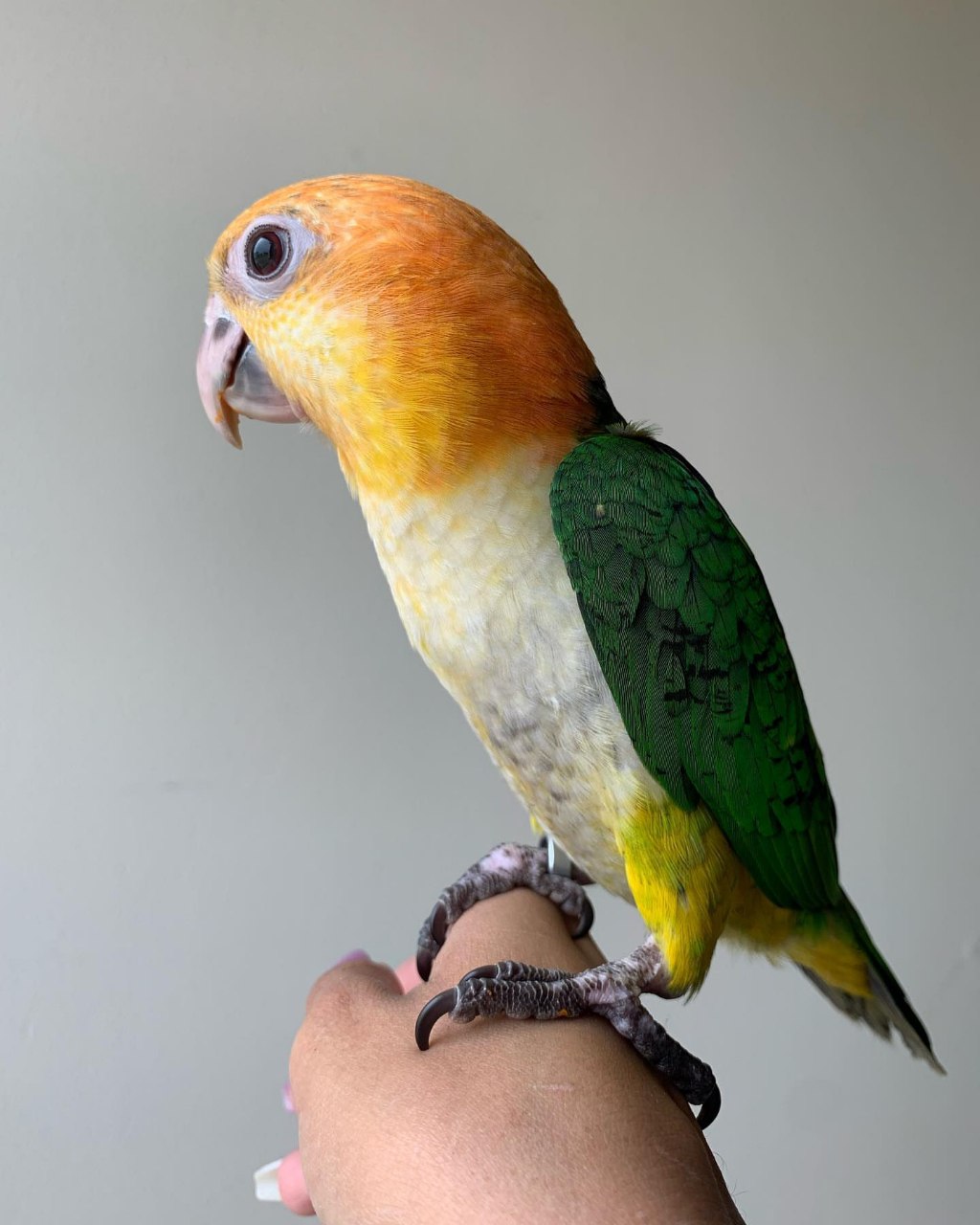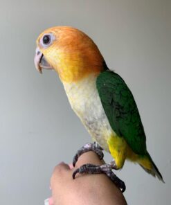 This lively and entertaining White-Bellied Caique parrot is ready to become a joyful companion in his new home.